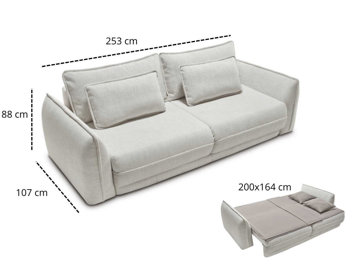 Le canapé Mojave est équipé d'un mécanisme d'ouverture de type DL, permettant de le convertir facilement en un lit confortable avec une surface de couchage de 200x164 cm. Il dispose également d'un coffre de rangement intégré, idéal pour ranger vos couettes et oreillers.