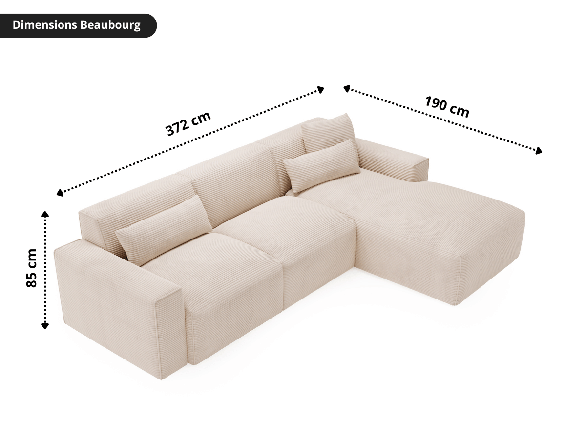 Disponible en angle droit ou gauche, il s’adapte facilement à votre configuration. La structure robuste en bois et panneaux de particules est complétée par une assise confortable composée de mousse polyuréthane haute densité et de ressorts zig-zag. Avec ses dimensions généreuses de 372 cm de large et 190 cm de profondeur, le modèle Madeleine devient sans effort la pièce maîtresse de votre salon.