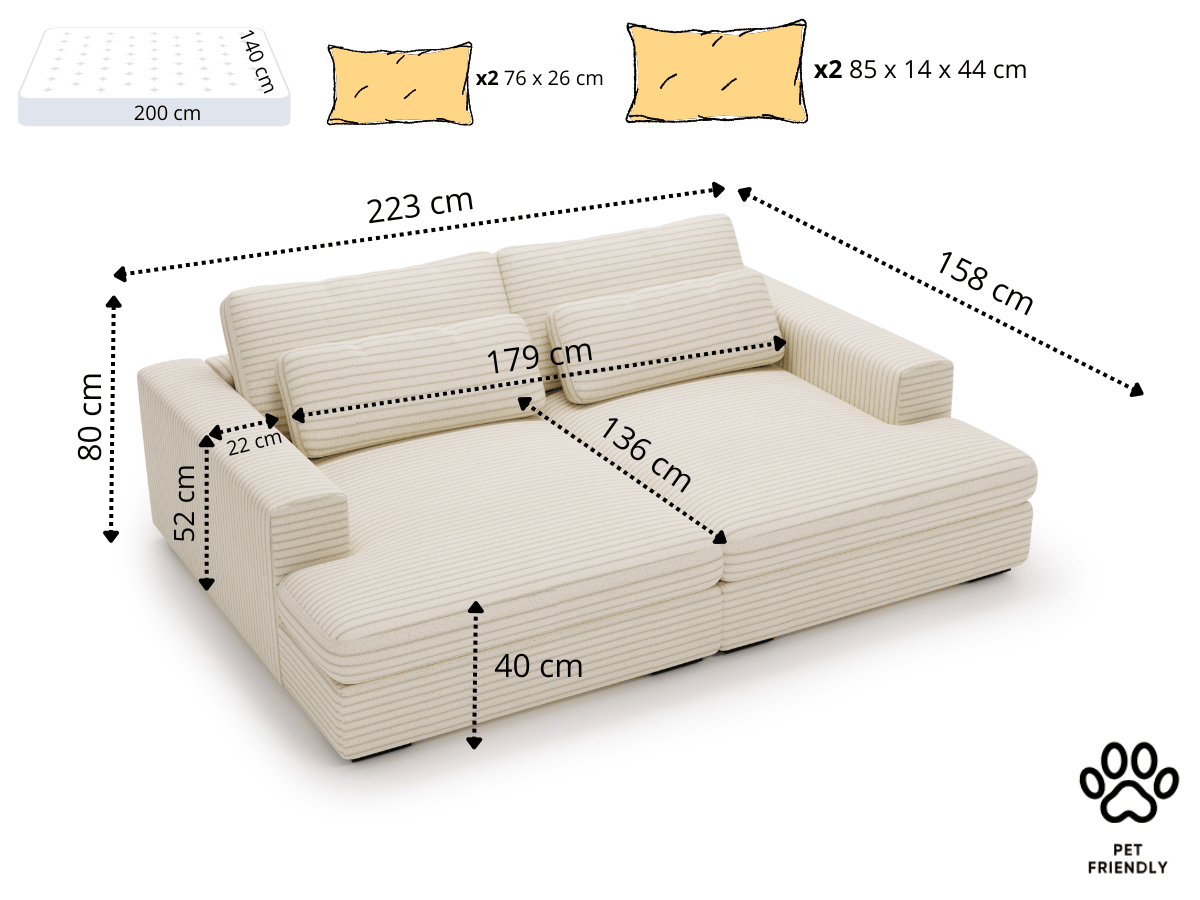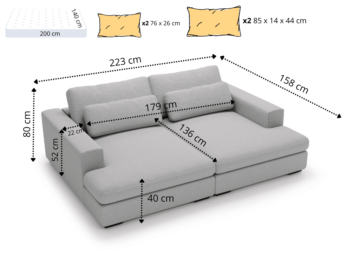 Avec la banquette Montparnasse, profitez d’un confort incomparable dès que vous vous asseyez. Son format généreux vous permet de vous installer confortablement, presque comme si vous étiez allongé. Idéale pour se détendre, regarder un film ou partager un moment convivial, elle offre une assise spacieuse qui s’étire sur 200 x 140 cm, soit l’équivalent d’un véritable couchage. Pas besoin de mécanisme, pas de compromis sur l’espace : juste une banquette conçue pour un bien-être total, de jour comme de nuit.