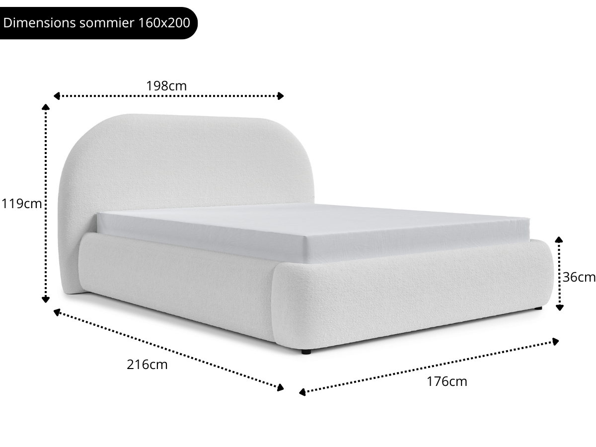 Disponible en velours ou en tissu boucle, il s'adapte à tout style de chambre. Les options de taille, 160x200 et 180x200, offrent une flexibilité pour répondre aux besoins d'espace et de confort de chacun, rendant ce lit à la fois pratique et esthétiquement attrayant.