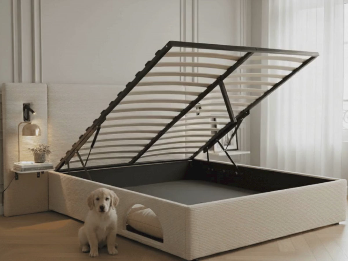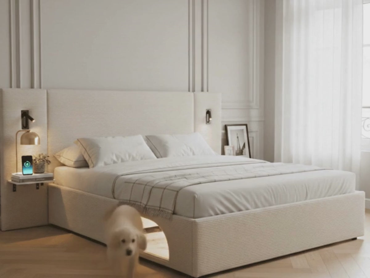 Le lit Élysée – CosyPet Edition est un lit coffre design haut de gamme pensé pour offrir un maximum de confort, de rangement et de fonctionnalités dans une chambre moderne. Ce lit adulte avec tête de lit XXL rembourrée séduit par son style contemporain, son tissu doux et texturé et son rendu élégant inspiré des chambres d’hôtel de luxe. Entièrement équipé, ce lit avec coffre de rangement intègre un grand espace de stockage sous le sommier, idéal pour ranger couettes, oreillers, linge de lit et vêtements, tout en optimisant l’espace dans la chambre. Le système de levage robuste permet une ouverture facile et sécurisée du coffre, rendant ce lit coffre adulte aussi pratique qu’esthétique. Le lit Élysée est également un lit avec tables de chevet intégrées, offrant un véritable gain de place et une organisation optimale au quotidien. Chaque tablette est conçue pour accueillir téléphone, livres et objets personnels, et dispose de ports USB intégrés permettant de recharger facilement smartphone, tablette ou accessoires connectés sans installation supplémentaire. Ce lit moderne avec USB et éclairage LED intégré propose un éclairage d’appoint doux et chaleureux, parfait pour créer une ambiance cosy et fonctionnelle dans la chambre. La tête de lit XXL assure un excellent confort pour lire ou se détendre et structure visuellement l’espace grâce à son design épuré et contemporain. La CosyPet Edition se distingue par un espace dédié pour animal de compagnie, directement intégré à la structure du lit, permettant à votre chien ou animal domestique de profiter d’un couchage confortable assorti au lit, sans encombrer la pièce. Ce lit design avec rangement, éclairage, USB et chevets intégrés est livré avec toutes ses options incluses, sans compromis, et constitue une solution idéale pour ceux qui recherchent un lit coffre moderne, un lit gain de place, un lit avec tête de lit large, un lit fonctionnel et élégant, parfaitement adapté aux intérieurs contemporains, chics et minimalistes.