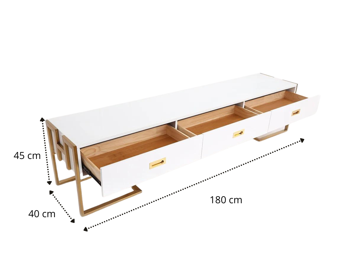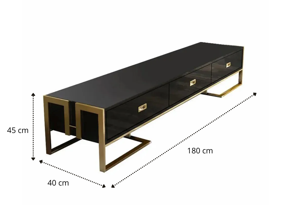 Caractéristiques principales : Matériau : Bois massif, acier inoxydable, verre trempé Finition : Or Couleurs disponibles : Noir, Blanc Dimensions : 180x40x45 cm Rangement : Trois tiroirs spacieux