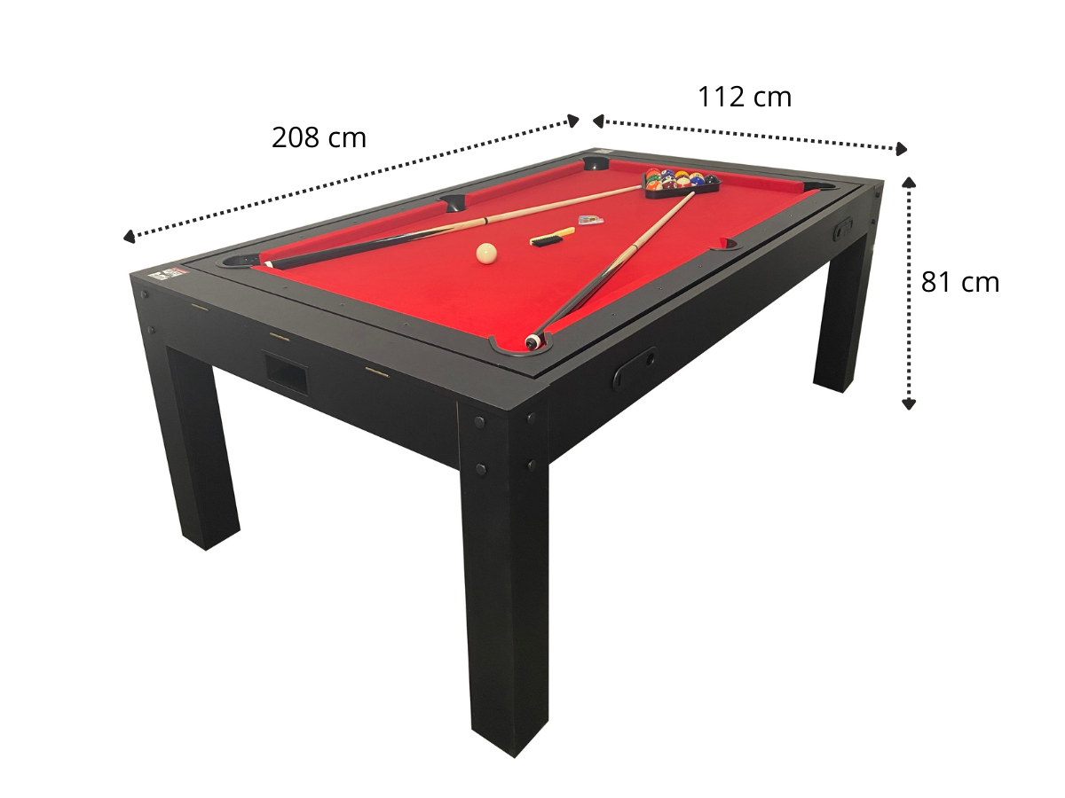 Dimensions: Longueur 112 cm, Profondeur 208 cm, Hauteur 81 cm, Poids 140 kg, Surface de jeu 177 x 101 cm. Disponible en plusieurs finitions : noir avec tapis rouge, blanc avec tapis gris, et bois avec tapis gris, offrant ainsi une variété pour correspondre à tout style d'intérieur. La construction robuste en MDF garantit durabilité et résistance, adaptée à une utilisation régulière pour les repas et les jeux.