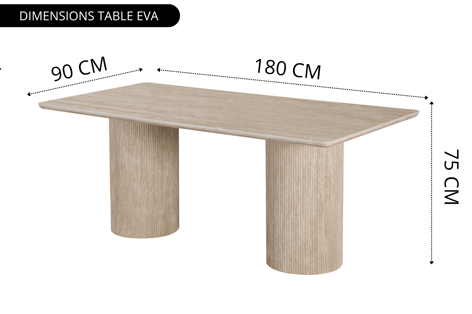 La table à manger EVA se distingue par ses lignes épurées et ses pieds cylindriques striés au look architectural. Leur finition beige clair, parfaitement assortie au plateau en pierre naturelle type travertin, crée une harmonie visuelle qui transforme cette table en véritable pièce maîtresse. Son allure à la fois moderne et intemporelle en fait un choix idéal pour sublimer une salle à manger contemporaine ou un intérieur inspiré des maisons méditerranéennes.