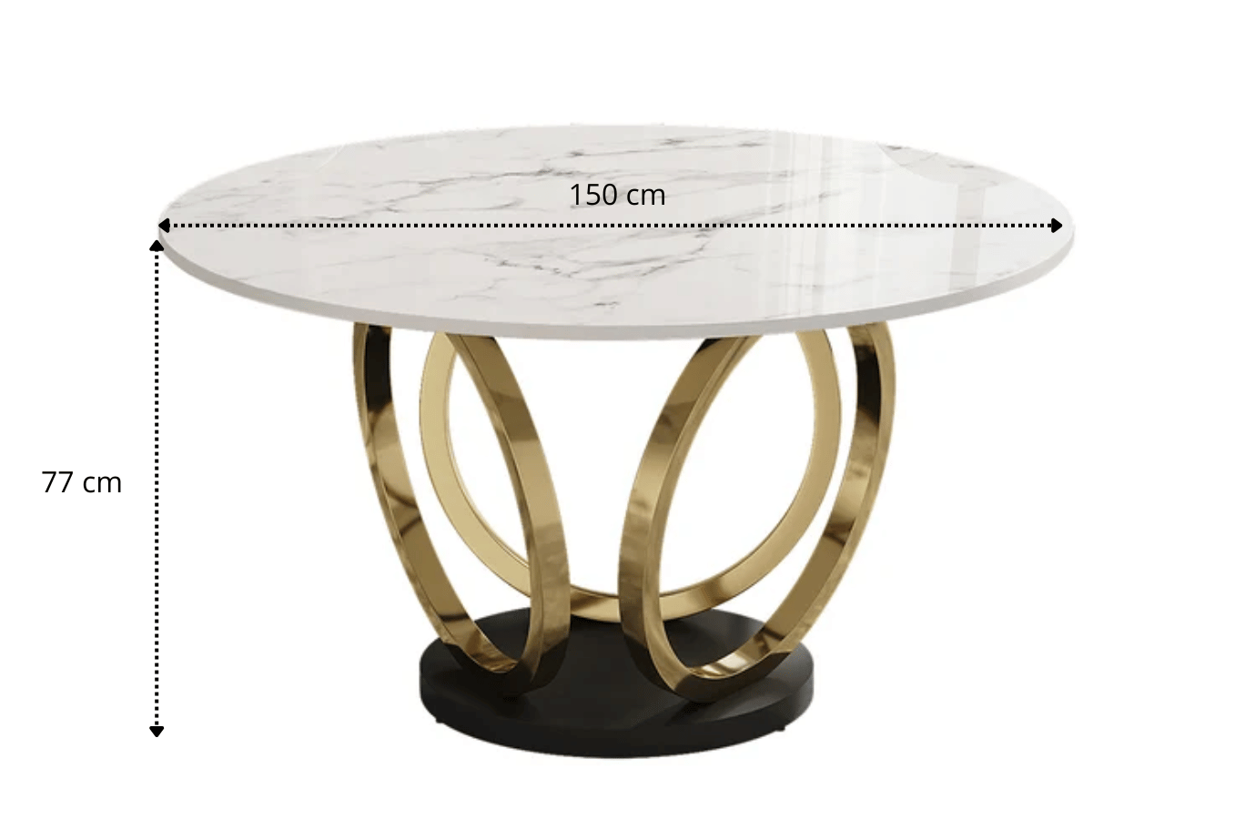 Dimensions: Longueur 150 cm, Hauteur 77 cm. Entretien: Nettoyage facile avec un chiffon humidifié. Descriptif du produit: Assemblage requis, Matériau du cadre: Métal avec finition or, Matériau du plateau: Céramique avec effet marbre blanc.