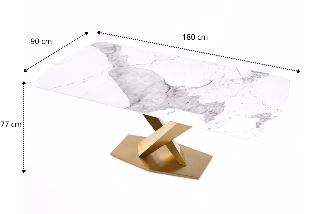 Caractéristiques Techniques: Matériau du plateau: Céramique effet marbre blanc et noir, Matériau du cadre: Métal avec finition couleur Or, Dimensions: Largeur 180 cm, Profondeur 90 cm, Hauteur 77 cm, Entretien: Nettoyage facile avec un chiffon humidifié, Assemblage Requis: Oui.